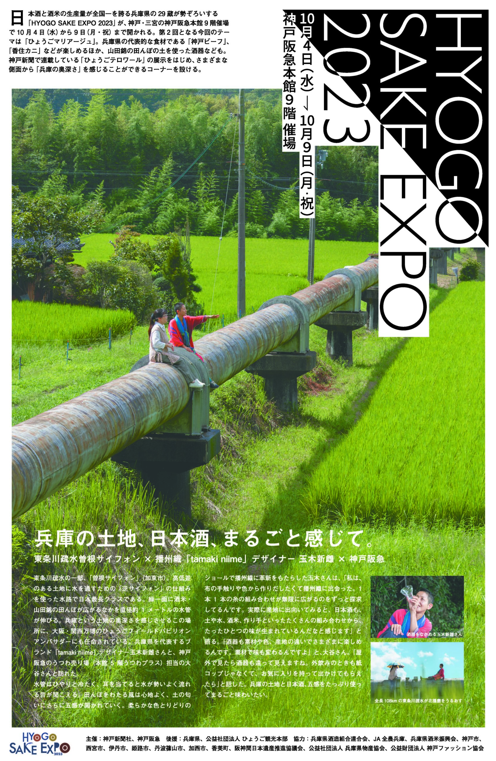 兵庫県内の酒蔵が集まり、日本酒の販売やセミナーを通して日本酒の楽しみ方を提案するイベント「HYOGO SAKE EXPO 2023」(神戸新聞社主催・神戸阪急にて開催)。そのタブロイド紙の表紙を制作。日本酒好きな方はもちろん、日本酒にあまり興味がない方にも興味を持っていただく仕掛けとして、兵庫という土地やお酒の魅力を五感でたっぷりと味わっていただく表紙として、インパクトのある兵庫の風景と伝統産業の革命的なブランドの玉木新雌氏というかけあわせを提案。撮影ロケから取材・デザインまで行った。