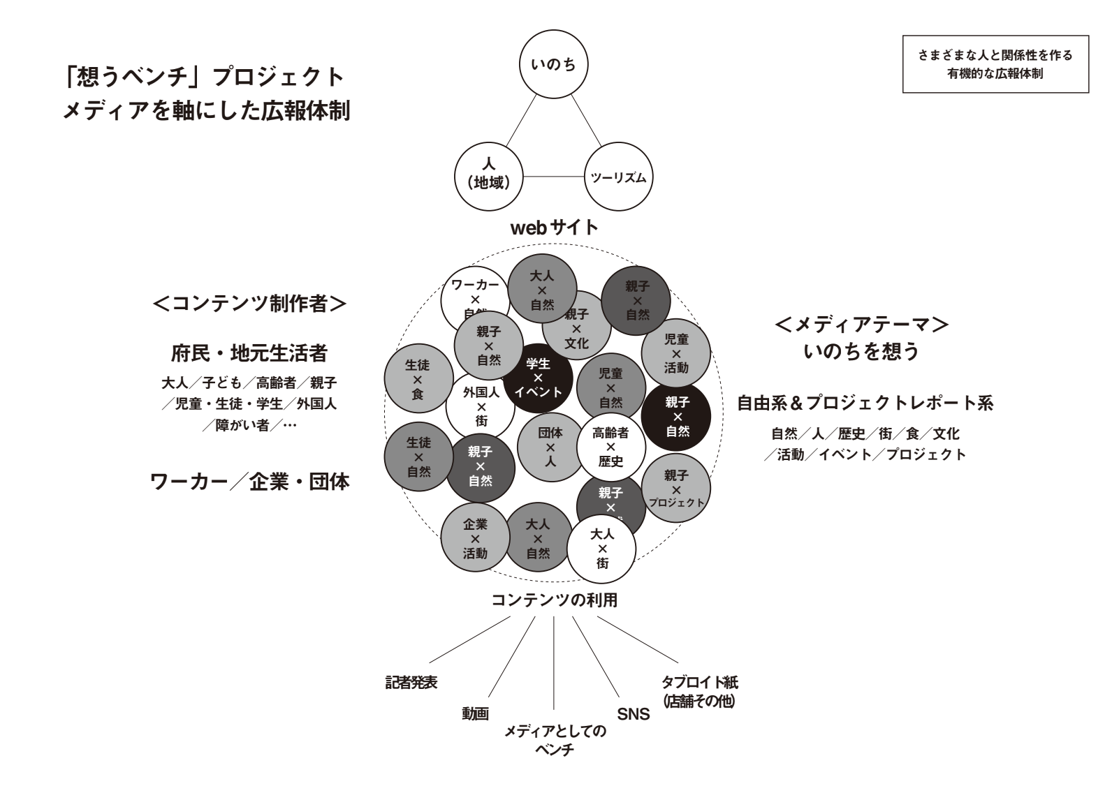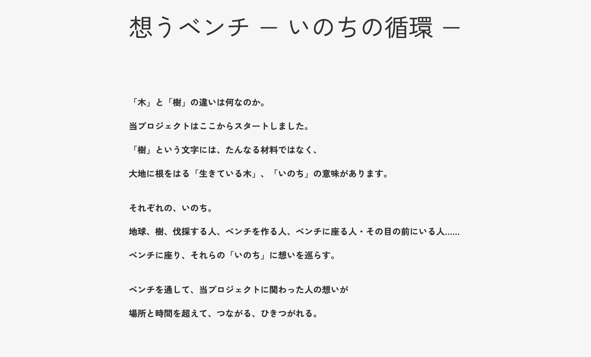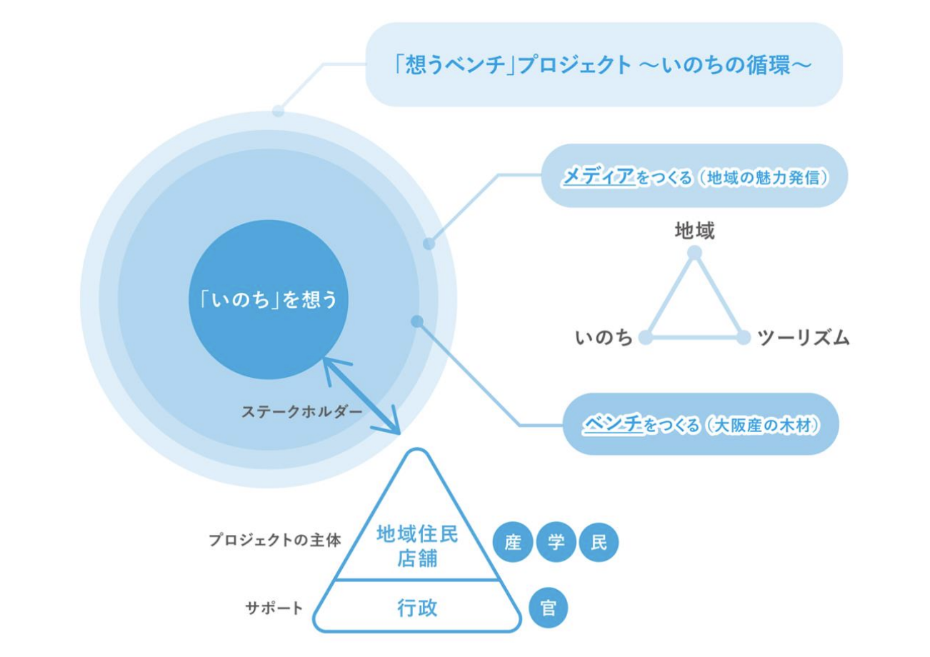 エイチ・ツー・オー リテイリング(株)が進める「大阪 森の循環促進プロジェクト」の一環として始動し、2025 大阪・関西万博の運営参加特別プログラムCo-DesignChallenge にも採択されたこのプロジェクト。「大阪の木材でベンチを作り万博に設置、そのあと地域で使っていただく」という当初の軸に、効果的な広報実現のため、府民ライターとともにメディアをつくり発信するというアクションを一体化させ、「『いのち』を想う」を核とした1 つのプロジェクトとして提案。運営協力として体験設計やメディアのコンテンツ企画、府民ライターの編集サポートまで行っています。